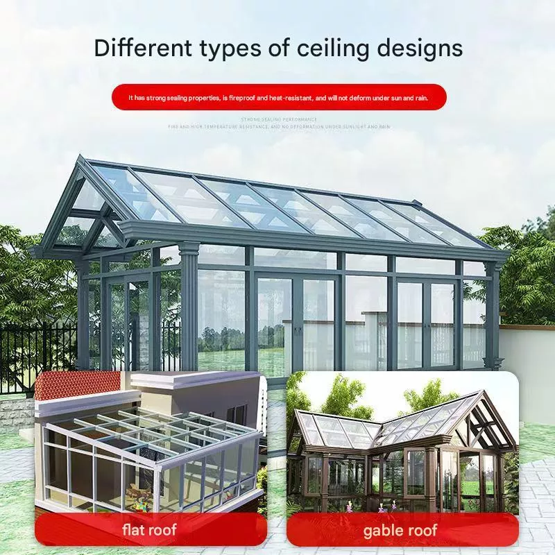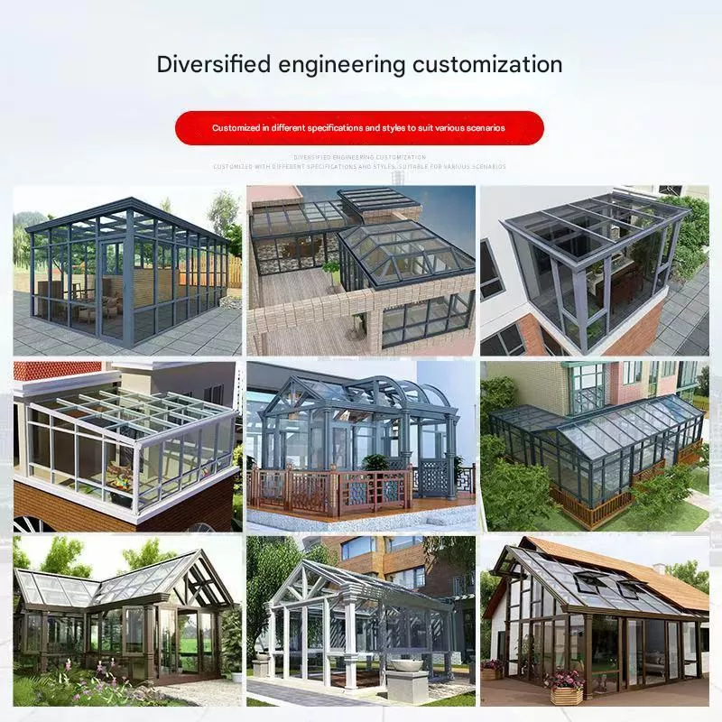 Sunroom adoptoi a lämpökatkoinen alumiinirunko + eristetty karkaistu lasirakenne. Runko koostuu pylväistä, palkeista ja diagonaalisista tuista, jotka on koottu modulaarisen järjestelmän avulla tukee useita kattotyylejä, mukaan lukien harjakatot, tasakatot ja kaarevat katot .